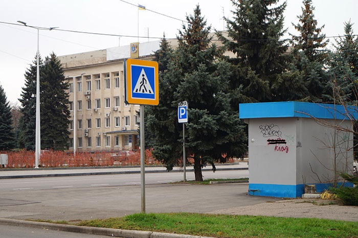 На фото: центр Краматорска, вид на здание городского совета и свежевыкрашенное здание на центральной площади города.