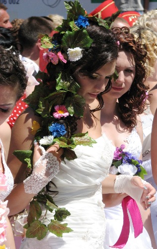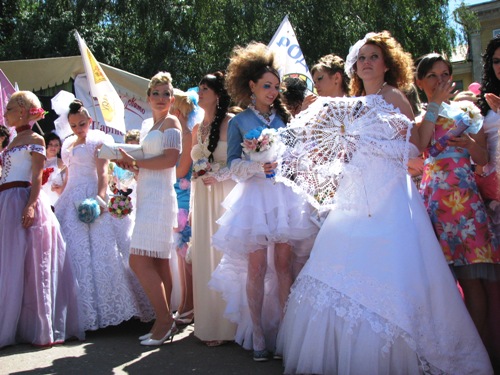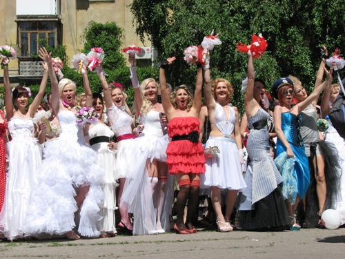 Шествие началось от входа в парк им. Пушкина к ресторану «Чумацкий шлях», а затем – к толпам зрителей, собравшихся у кинотеатра «Родина». Здесь их встречала музыкой дружковская группа «Безоркестра» и бесчисленные фотографы и видеооператоры. Зрелище 60 невест было потрясающим!