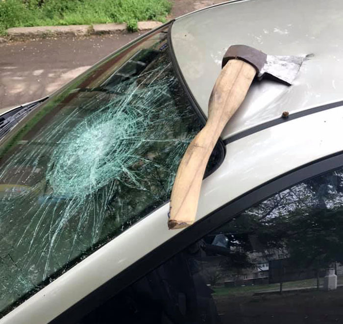 Утром 4 мая в электронных СМИ Краматорска появились достаточно шокирующие фотографии автомобиля "Мазда", по которому кто-то "прошелся" топором, причем орудие преступления, явно демонстративно, было оставлено на месте. Инцидент произошел во дворах многоэтажных дворов по улице Дворцовой.