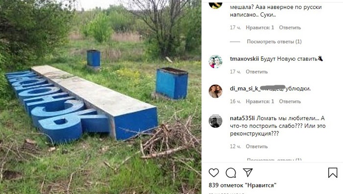 Как и водится, фотография вызвала яркие комментарии со стороны пользователей, демонстрирующие их уровень интеллектуального развития: предположения, что стелу изуродовали вандалы, что металл намерены украсть с целью сдачи на металлолом (и это в 200 м от Патрульной полиции, ай-я-яй!), и до умозаключения, что название поселка на стеле написана по-русски, вот поэтому и.