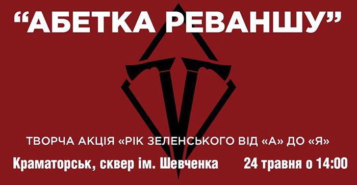 У неділю, 24 травня, с 14:00 на площі Миру (біля пам’ятника Шевченку) краматорський осередок партії "Демократична сокира" презентує виставку “Абетка реваншу” - наше бачення року президента Зеленського від “А” до “Я”.