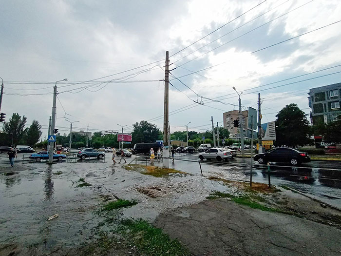 Участок автодороги и тротуара по улице В. Стуса в районе 3-й поликлиники в Краматорске становится озером всегда, после любого дождя. Проблеме уже не один десяток лет, и, несмотря на ремонты дороги, сегодняшний дождь снова вызвал здесь настоящий потоп.