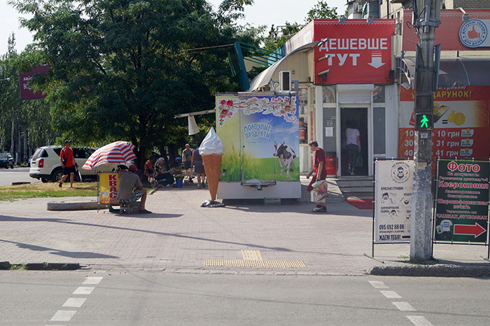 Несколько дней назад на улице Дворцовой в Краматорске, буквально посреди пешеходного тротуара, вдруг разместился металлический ящик по торговле молочными продуктами. "Посреди тротуара" - это нисколько не преувеличение, о чем можно судить по прилагаемому фото.
