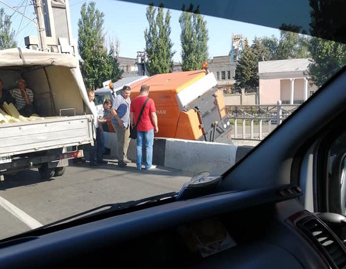 Сегодня, 16 июля, на мосту через Казенный Торец, неподалеку от проходных завода СКМЗ, произошло трагикомичное ЧП: машина-пылесос, предназначенная для уборки улиц, провалилась в яму, слегка прикрытую сверху коркой асфальта. Соответствующее фото появилось в Facebook.
