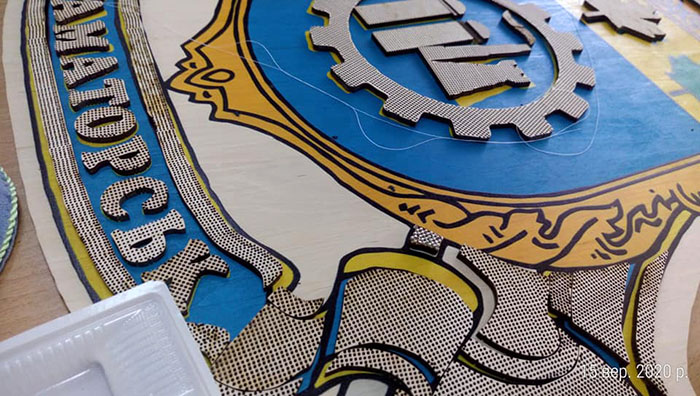Герб состоит из деревянных элементов, в которых прорезаны отверстия, их украшают бисером. Приобщиться к процессу может каждый желающий. Вышивать разрешается и дома.