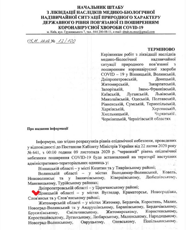 Сегодня, 5 ноября, официальный сайт горсовета Славянска опубликовал информацию, согласно которой с понедельника, 9 ноября, города Угдедар, Краматорск, Новогродовка, Славянск и Славянский район переходят в так называемую "красную" карантинную зону (см. скан ниже).
