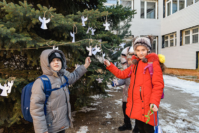 Разом із учнями 4-Б класу гості під музику “Пливе Кача” розвісили білих паперових ангелів на подвір’ї школи.