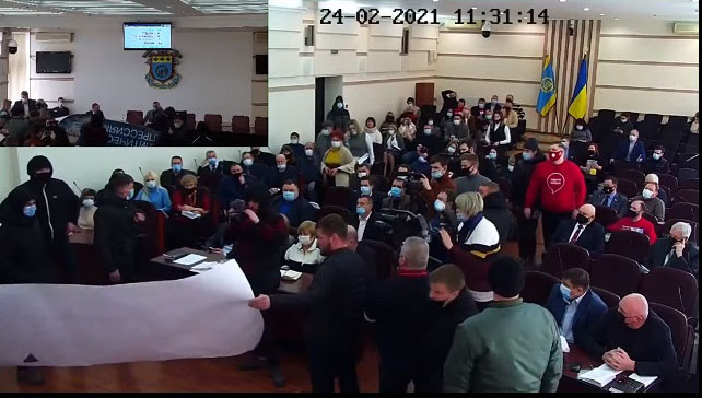 Выстроившись перед трибуной, какого-либо внятного заявления гости не сделали, держа плакат с изображением ныне разыскиваемого СБУ Шария почему-то в перевернутом виде. Несколько депутатов горсовета, включая представителей партии Шария, пытались им противодействовать, в результате в зале возникла легкая потасовка, на фоне которой депутат Александр Ермольченко произнес в микрофон фразу про "всякое быдло, которое будет нам тут мешать".