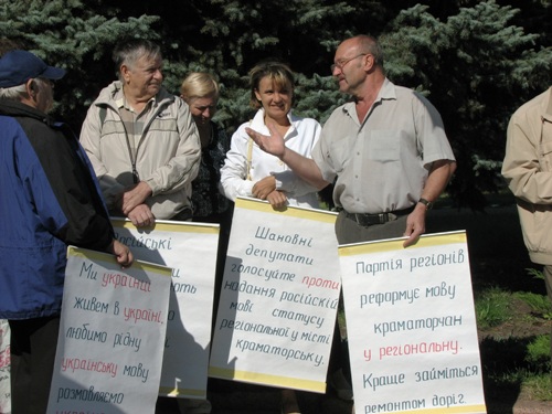 С утра у входа в здание исполкома, депутатов встречал немногочисленный пикет противников "языкового" решения, в составе которого находились представители политических партий "Народный Рух" и "Свобода". Выяснилось, что вопрос о русском языке не прошел предварительное слушание членами исполкома горсовета, и более того, включен в повестку дня сессии без номера, самым последним по счету.