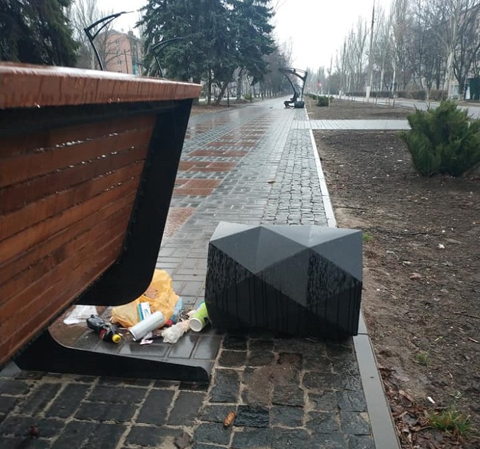 Утром 7 апреля Краматорское КП УРСАС поделилось в Facebook фотографиями последствий веселья неких личностей с нетрадиционным представлением о порядке, которые устроили погром на недавно отремонтированном бульваре Машиностроителей.
