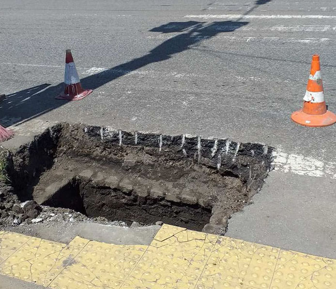 Работники Краматорского КП ДРУАС сообщили в Facebook об удивительном открытии. вчера, 15 июня, на пересечении бульвара Машиностроителей и улицы Парковой, они обнаружили ливневый колодец, давно и тщательно погребенный под слоем асфальта. Археологическое открытие нынче огорожено, и расчищается от асфальта и грязи.