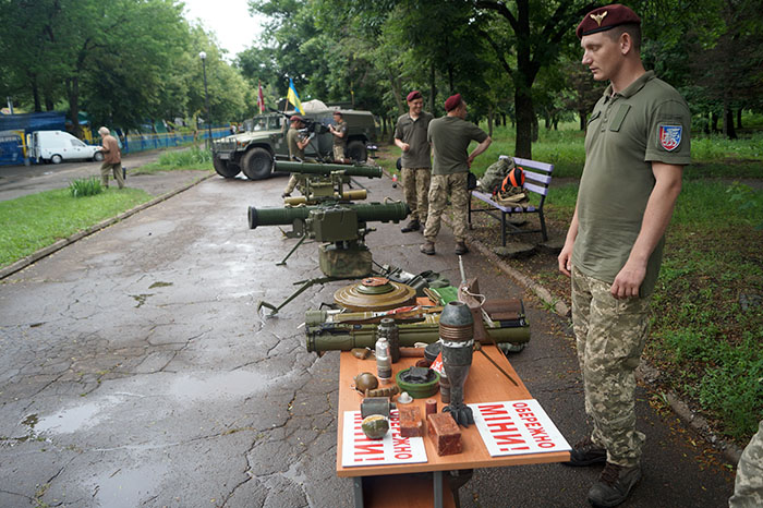 Возле входа в городок аттракционов краматорского парка "Юбилейный" сегодня, 18 июня, открылась выставка современного оружия украинской армии.