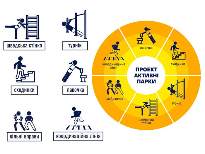 Наповнення активних парків – найпростіше, щоб кожен мешканець країни, незалежно від території проживання, мав вільний доступ до можливості займатись спортом у будь-який час. Активний парк представляє собою спортивну локацію із 6 елементів: «шведську» стінку, комплекс турніків/гімнастичних брусів, лавку для виконання динамічних вправ, сходинки, координаційну лінію та вільний простір.