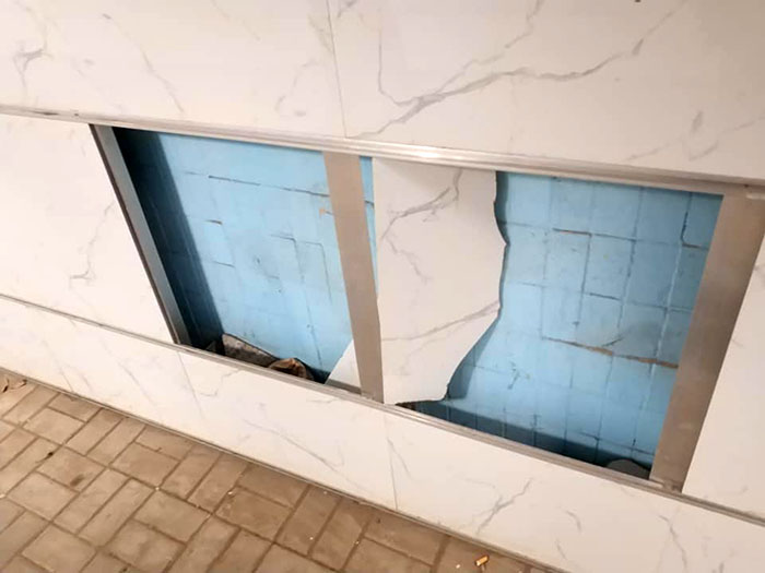 В переходе побита настенная плитка, погнуты элементы потолочного перекрытия...