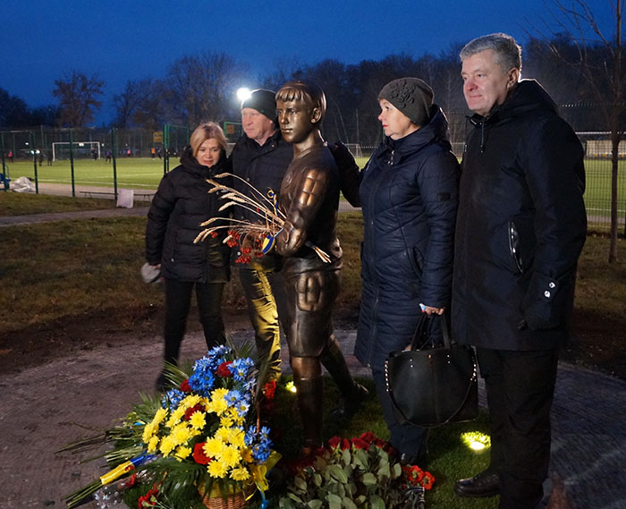 А на обратном пути Петр Порошенко и сопровождающая его нардеп Ирина Геращенко заехали в краматорский Сад Бернацкого, где несколько дней назад был установлен памятник Народному герою Украину, футболисту Степану Чубенко, убитому в 2014-м году пророссийскими боевиками. Здесь политиков ждали партийцы и представители общественности.