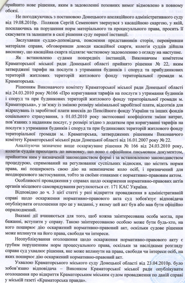 Напомним предысторию вопроса. Узнав о мартовском решении исполкома (№166) о корректировке тарифов на содержание жилья, председатель правления Краматорского общества защиты прав потребителей Сергей Поляков (на фото) подал исковое заявление в суд. Несогласие с действиями местных властей Сергей Поляков пояснял нарушениями действующего законодательства. Ознакомившись с претензиями истца, городской суд счел их достаточно вескими, и в мае 2010 года решение горисполкома отменил. Естественно, власти обжаловали это решение в Апелляционном суде Донецкой области, где сочли неправильным решение Краматорского суда. Тогда Сергей Поляков обратился в Высший административный суд Украины.