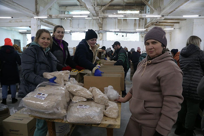 Щодня майже 500 волонтерів фасують продукти тривалого зберігання.