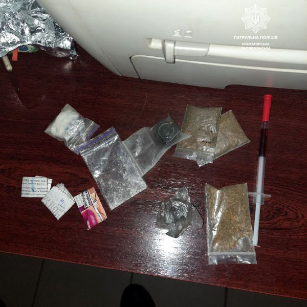 Уже во время проверки в Краматорском РУ полиции, в сумке у дамы были обнаружены многочисленные пакетики и бумажные свертки с порошком белого цвета и веществом растительного происхождения, шприц с вероятно наркотическим веществом.