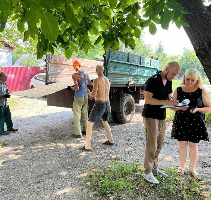 Мешкаці Краматорська (в районі вулиці Рибінська) отримують допомогу для ліквідації наслідків російських обстрілів.