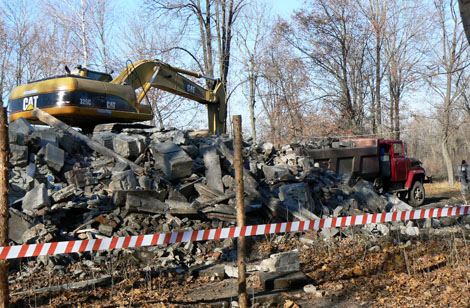 Утром следующего дня стало ясно, что же возили грузовики. Перестало существовать старое здание бывшей бильярдной в парке Пушкина. Теперь вместо него – груда обломков, на самом верху которой красуется экскаватор. Здесь же, за предупреждающей лентой, стоят строительные вагончики, из которых довелось услышать многоэтажные и красочные матерные разговоры. Однако в личной беседе рабочие предпочитают держать язык за зубами: ни кто ломает, ни что строит, ни куда возят останки бильярдной…