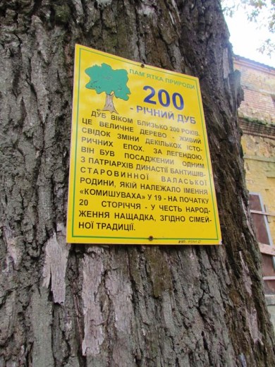 "Табличка на 200-летнем дубе в Краматорском региональном ландшафтном парке напоминает, что это дерево - "живой свидетель смены нескольких исторических эпох". Табличка закреплена шурупами, завинченными в дерево, а сам дуб обтянут тросом, закрепленным гвоздями".