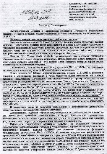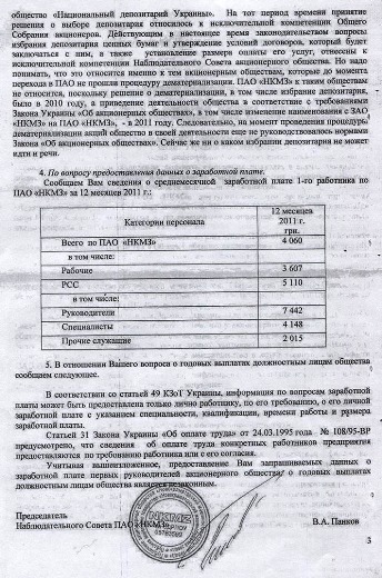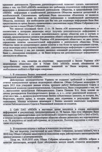 По словам Тихоненко, ответ, который он получил, был простой отпиской. Завод сообщил, что всю необходимую информацию акционер уже получил на собрании (в действительности, такая информация, согласно официальному протоколу, озвучена не была), и никаких дополнительных пояснений НКМЗ давать не обязано. В частности, никто не смог объяснить, зачем и каким образом был создан специальный фонд в 136,7 млн грн. Не была предоставлена информация о доходах первых лиц предприятия.