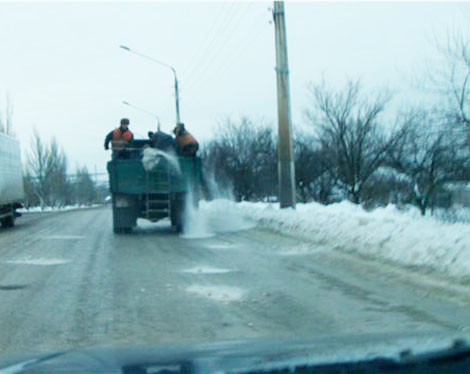 Вчера один из пользователей городского Интернет-форума "Kramatorsk.info" разметил фото, свидетельствующие о том, насколько высоко продвинулись коммунальные службы города вборьбе со стихией. Фото были сделаны около 5 часов вечера в районе Артемовского переезда. Причем газета "Новости Краматорска" даже высказала предположение, что на фото изображен процесс нанесения на дорожное покрытие "уникального средства, которое способно топить снег даже при низких температурах. Его закупку и экспериментальное применение анонсировал заместитель городского головы Андрей Бессонный на последнем аппаратном совещании".