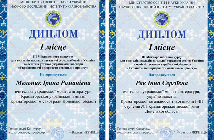 З 20 січня по 05 квітня 2023 року проходив ІІІ Міжнародний конкурс для вчителів закладів загальної середньої освіти України та освітніх установ української діаспори «Українознавчі пріоритети освітнього процесу» в якому взяли участь учителі нашого міста — Краматорську українську гімназію представила Мельник Ірина, а Краматорську загальноосвітню школу І-ІІІ ступенів №1 – Рак Інна.