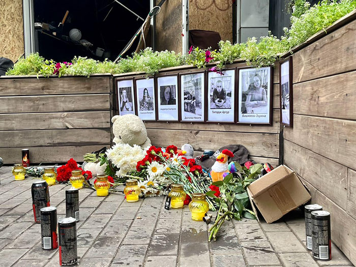 Люди несуть сюди квіти та іграшки, запалюють свічки пам'яті. І тут же – група зовсім молодих людей. Це – друзі та колеги загиблих працівників піцерії.