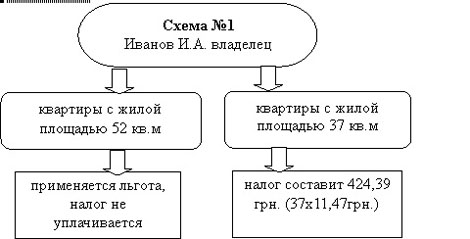 Вместе с тем, если один гражданин владеет не одним, а несколькими объектами жилой недвижимости (допустим, в собственности у него две квартиры), то воспользоваться правом на данную льготу он сможет только по одной квартире (в которой он прописан или по его выбору), а за другую квартиру налог необходимо будет уплачивать. То есть, ошибочно полагать, что владелец двух квартир (к примеру, одна из которых имеет жилую площадь 52 кв.м., а вторая – 37 кв.м.) с суммарной жилой площадью до 120 кв. м. тоже имеет право на данную льготу. В этом случае льгота применяется только к одной квартире, например, к квартире площадью 52 кв. м., а за квартиру площадью 37 кв.м необходимо будет уплатить налог в размере 37х11,47=424,39 грн. (схема №1)
