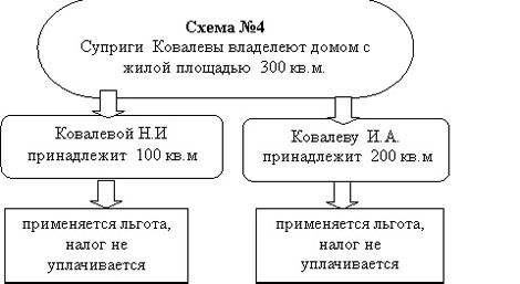 3. В собственности супругов находится жилой дом площадью 300 кв.м. , одному принадлежит 100 кв.м, другому – 200 кв.м. Несмотря на то, что общая площадь дома превышает льготную (300 больше 250), каждый из владельцев имеет право воспользоваться льготой на принадлежащую ему жилую площадь. Если другой недвижимости у них нет, то в указанном случае налог также уплачиваться не будет (схема №4).
