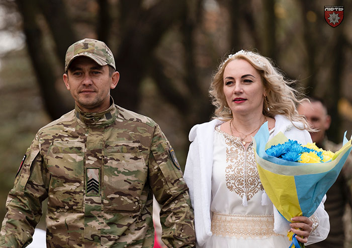 Фронтове весілля відбулося за усіма традиціями - військова форма нареченого та білосніжна сукня нареченої. Засвідчив шлюб закоханих командир бригади "Лють" Олександр Нетребко, а урочисту церемонію провів особисто командир полку «Цунамі» Олександр Гостіщев