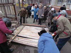 В сносе забора принимали участие как мужчины, так и женщины. Взрослым активно помогали дети, которые носили доски и ветки к соседней стройплощадке, сейчас они помогают убирать мусор. Активное участие в процессе приняли бабушки, которые гуртом носили секции забора.