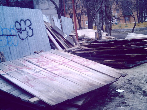 Забор стройплощадки между 11-м и 13-м домами был разобран за час, теперь жильцы принялись за уборку территории: строители «Интервитражсервиса» оставили после себя кучи мусора, ямы и траншею.