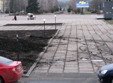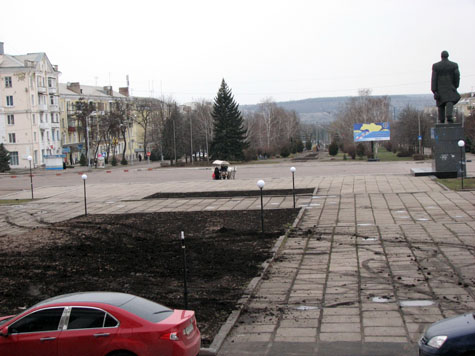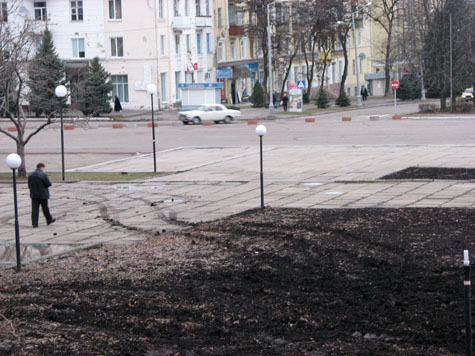 Клумбы, по сути, нет. Вместо нее глазам предстает развороченное автомобильными колесами грязное месиво, жирные следы от которого тянутся от клубмы в двух направлениях. Создается впечатление, что некто влетел на клумбу под дождем, а потом выбирался их нее, долго буксуя. И это - посреди центральной площади Краматорска!