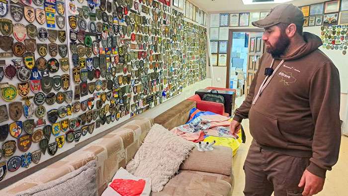 "Я вважаю, що це — честь для нас, що їхні шеврони тут знаходяться", — каже співзасновник волонтерського хабу Ваге Маміконян.