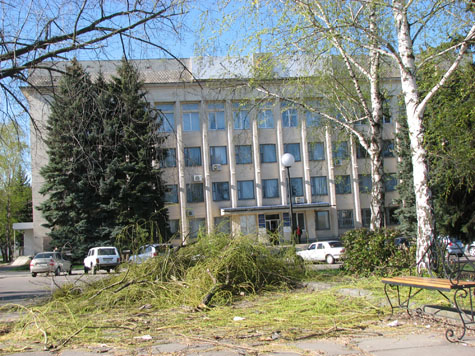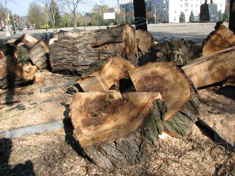 Сегодня утром на центральной площади Краматорска жужжали мотопилы и трещали ветки. У бывших фонтанов напротив ДКиТ НКМЗ валили старые ивы.