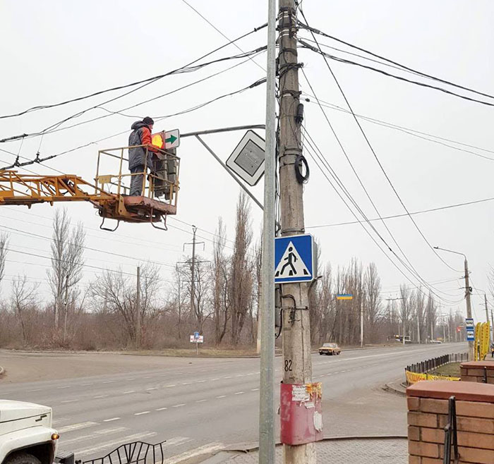 Згідно з рекомендаціями співробітників відділення безпеки дорожнього руху патрульної поліції, КП «Міськсвітло» встановило, в експериментальному порядку, таблички з зеленою стрілкою, що дозволяє повороту направо під час горіння червоного сигналу світлофору на наступних світлофорних об’єктах: