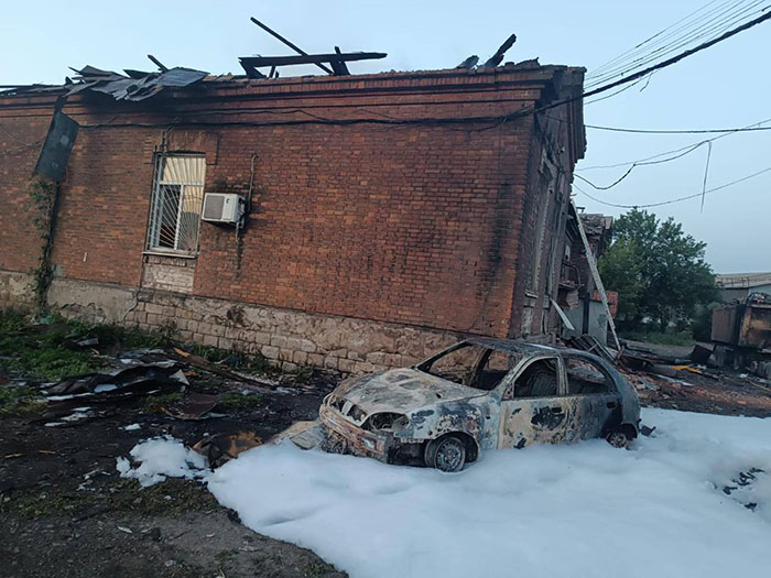 Окрім цього, внаслідок атаки пошкоджено чотири об’єкти, серед яких: адміністративна будівля, два вантажні та легковий автомобіль".