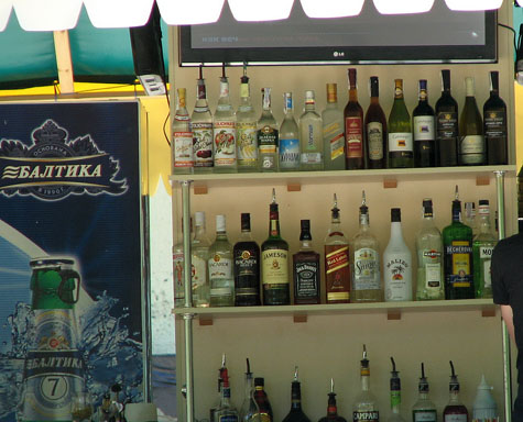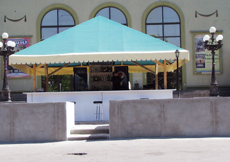 В соответствии с гениальной архитектурно-дизайнерской задумкой господина Алиева, некогда уютный, ныне фонтанчик приобрел вид армейского блок-поста. "Подвыпившим ребятам на джипах" здесь уже явно не проехать, это точно. Но зато, покинув джипы, этим же "ребятам" есть чем промочить горло, благо, что ассортитмент за стойкой ласкает и радует глаз не по-детски.