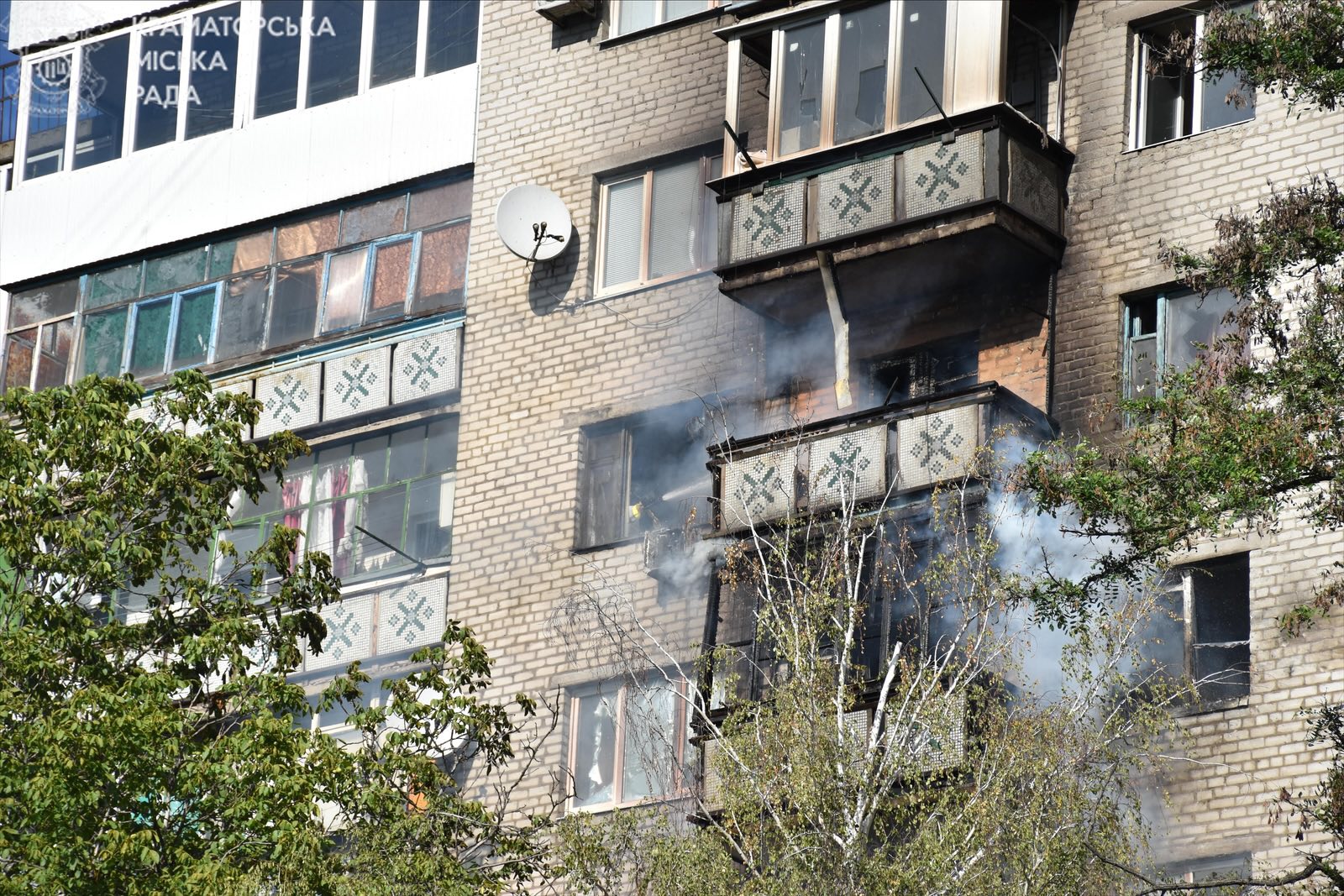 Близько 16 години з'явилися фото- та відеосвідчення того, що в результаті атаки почалася пожежа в одній із 9-поверхівок неподалік райвідділу поліції (Соцмістечко).