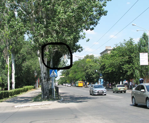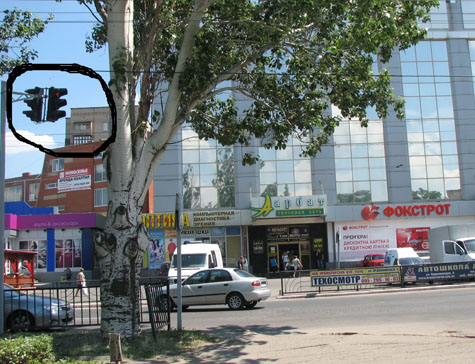 Объект для дутой сенсации № 2 дислоцируется куда ближе к зданию горисполкома Краматорска. Это - светофор на пересечении улицы Социалистической и проспекта Мира, аккурат напротив ЦУМа. Интересен же этот светофор тем, что он практически бесполезен для пешеходов из-за полностью закрывающих его веток, и для того, чтобы увидеть - можно переходить улицу или нельзя - люди вынуждены выскакивать на проезжую часть.