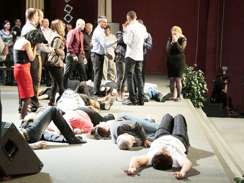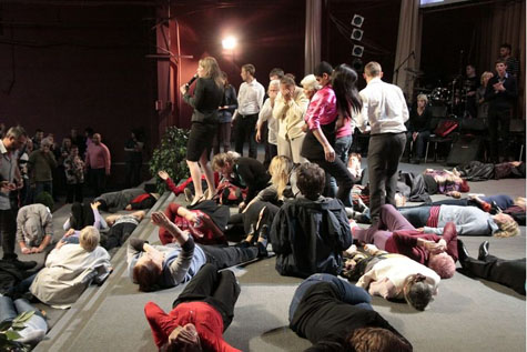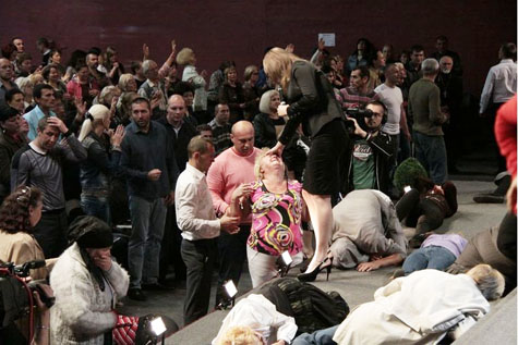 Не станет исключением и наступивший июль. Весь город активно завешивается рекламой сеанса пастора духовного центра "Возрождение" Владимитра Мунтяна, который обещает "разрушение родовых проклятий", "исцеление ДЦП", "опухолей головного мозга" и просто костей. На аренде помещения товарищ пастырь решил не мелочиться, и вскорости на главной культурной сцене Краматорска, где когда-то танцевал Вадим Писарев и давали спектакли лучшие творческие и театральные коллективы города, страны и мира, в ДКиТ НКМЗ, можно будет понаблюдать вот такие милые картинки: