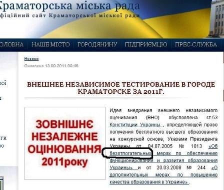 Сегодня на официальном сайте Краматорского горсовета появилась заметка под названием «Внешнее независимое тестирование в городе Краматорске за 2011 г.» Информация нужная, интересная и полезная, если бы не одно «но». В первом же абзаце этой заметки, как вы можете убедиться, взглянув на скриншот, напечатано нечто суржиковое, а потому с виду несуразное.