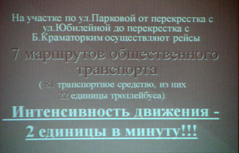 Что же касается сути вопроса - тут не только Александра Толстогузова, но и весь депутатский корпус ожидал сюрприз. Директор Краматорского ТТУ, депутат Сергей Шацкий подготовился к сегодняшней сессии более чем серьезно, отсняв и смонтировав (!) видео, из которого следует, что двусторонне движение по улице Парковой нельзя открывать ни в коем случае.