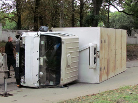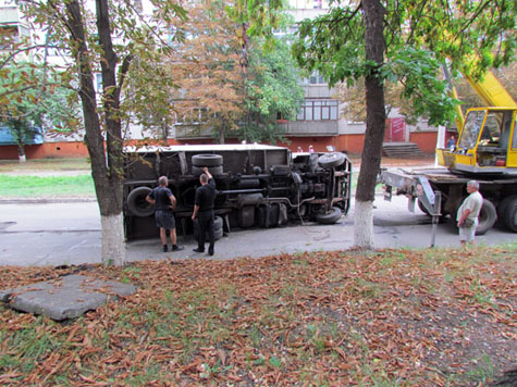 Сегодня утром, 28 августа, в Краматорске в Старом городе по ул. Школьной перевернулся грузовик, перевозивший молоко. Автомобиль с днепропетровскими номерами ехал с горы в сторону ул. Розы Люксембург и попал в аварию в районе 14-го дома, не доезжая до "лежачего полицейского".
