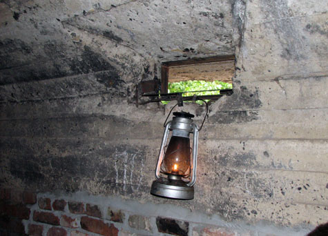 Внутри дот производит мрачное и гнетущее впечатление. Мрак, резкий запах от горящих ламп-керосинок, высоко расположенные бойницы бросают узкие снопы света… Хочется скорее обратно на свежий воздух, а если представить, что здесь еще велась стрельба, в кого-то стреляли, а в ответ летели снаряды, осколки и пули… Бр… Нет уж, миру – мир!