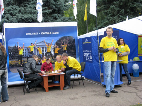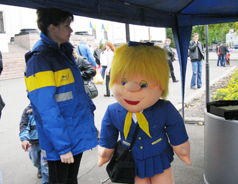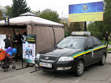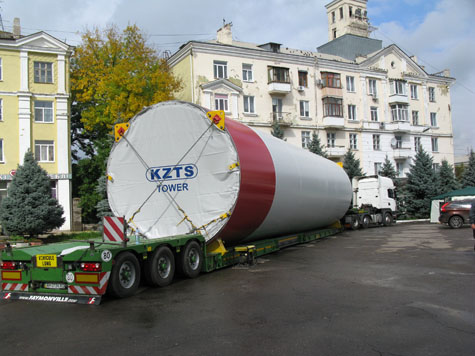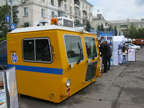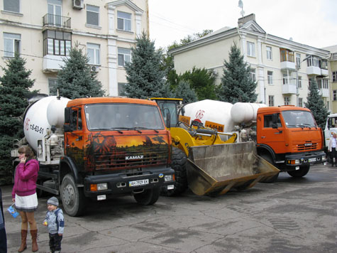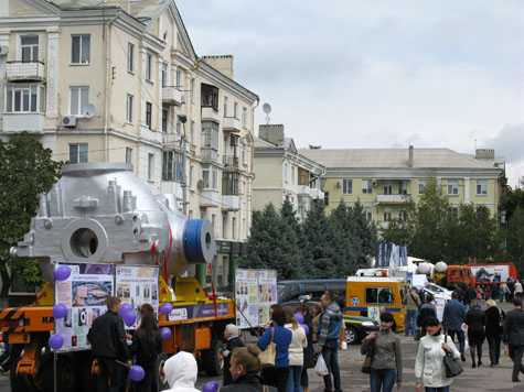 На самой площади сейчас разворачиваются участники имиджевой выставки "Город растущих возможностей". Всеобщее внимание привлекает гигантский фрагмент башни-ветряка производства КЗТС.