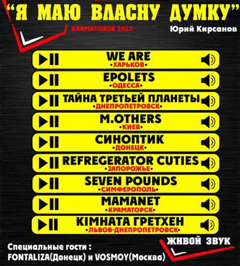 В этом году Краматорск собрал мощнейший состав рок-команд из самых разных городов Украины: Донецк, харьков, Одесса, Днепропетровск, Киев, Запорождье, Симферополь... Ожидается, что на сцене выступят следующие команды: