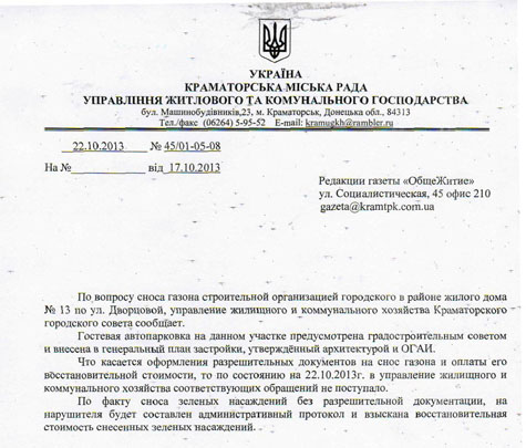 «Гостевая автопарковка на данном участке предусмотрена градостроительным советом и внесена в генеральный план застройки, утверждённый архитектурой и ОГАИ, - сообщает начальник УЖКХ Краматорска Сергей Гончаренко. - Что касается оформления разрешительных документов на снос газона и оплаты его восстановительной стоимости, то по состоянию на 22.10.2013г. в управление жилищного и коммунального хозяйства соответствующих обращений не поступало.